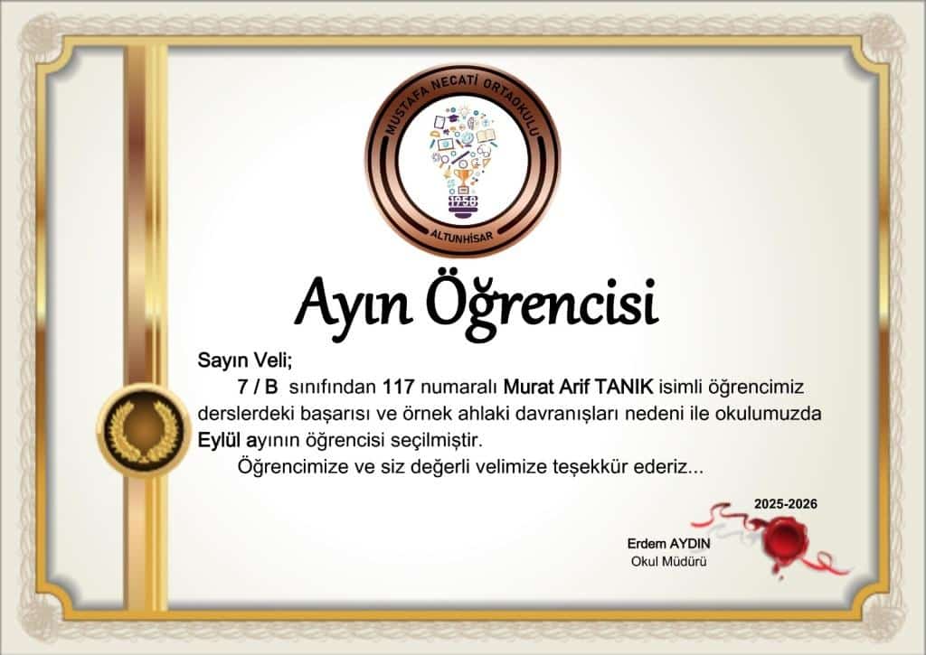 Eylül ayının öğrencisi 7/B sınıfından Murat Arif...